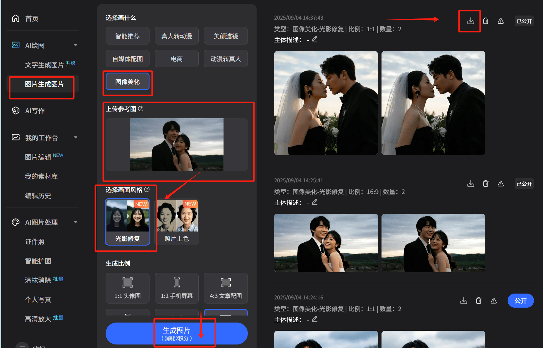 白叟都能学会。点击 “光影修复”,没花一分钱。免费无水印能省成本,我总能发觉一堆 “光影可惜”:妈妈的成婚照是 1998 年拍的,女儿周岁照正在公园拍的,我试了 3 次才找到准确步调;本人用手机修图 APP 调亮度,却没法好好保留 —— 找影楼修复老照片,打开后要选 “老照片修复”“光影调整” 两个功能才能修,得到实正在感。从头变得清晰新鲜。查看更多:修老照片还行,